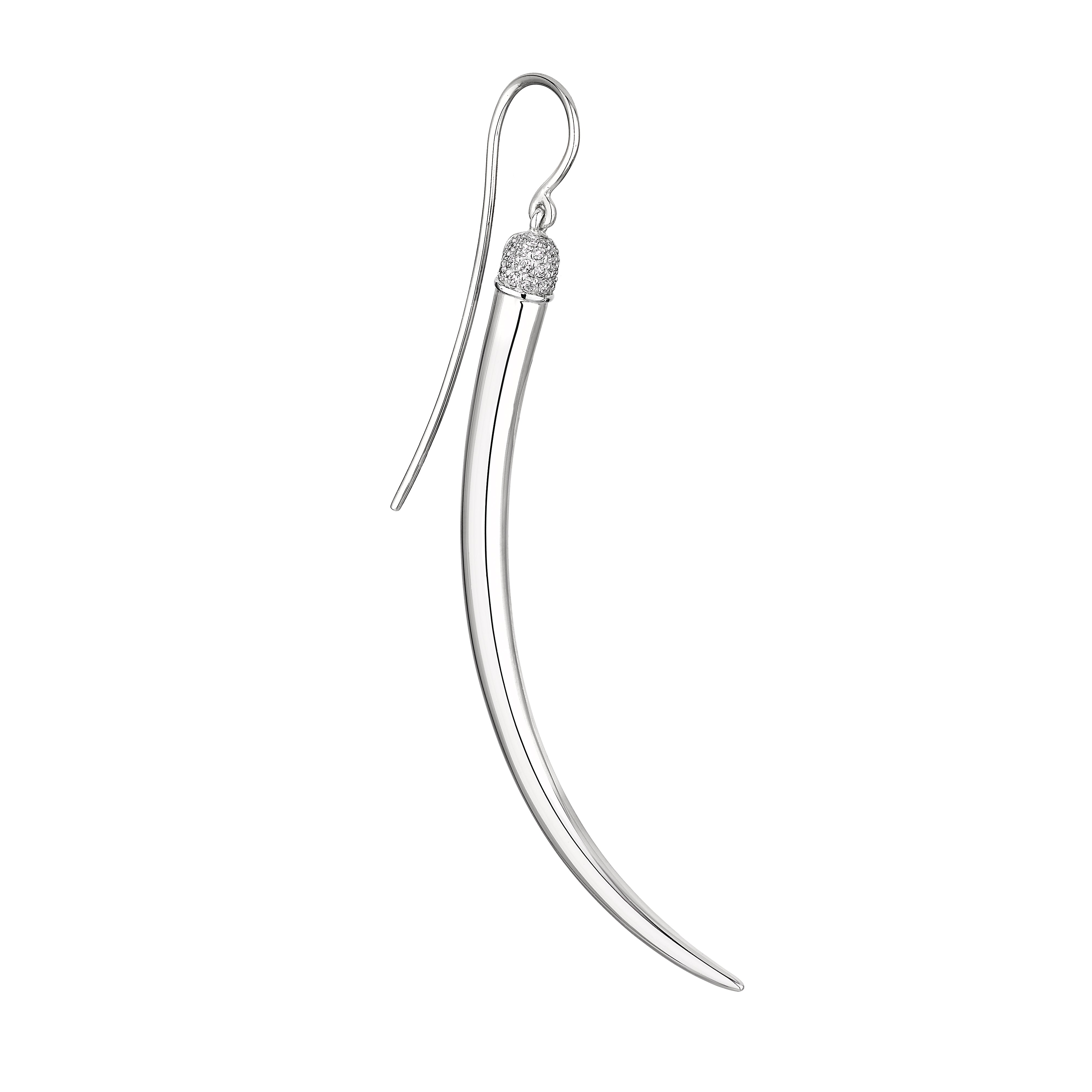 Handcrafted from sterling silver and 0.11cts of brilliant white diamonds, No.1 Single Large Earring is our 70mm diamond drop inspired by Shaun Leane’s iconic sculpted silhouette. Suspended in ethereal light, a sterling silver 70mm curve glides with the wearer, crowned with white diamonds, illuminating your neck whilst framing your jawline, fastened with a bold shepherd’s hook. Evoking freedom and an inner world, No.1’s beauty and simplicity offers a transcendent power that lifts the human spirit. Originally created by Shaun Leane for the Alexander McQueen 1996 show, The Hunger, we elevate a classic with a diamond pavé finish - an elegant showstopper.