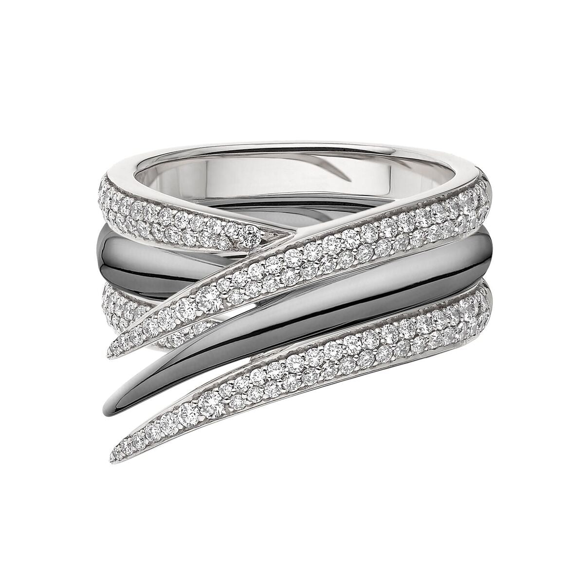 Interlocking Stacked Ring is handcrafted from 18ct white and black rhodium gold and 0.98cts of brilliant white diamonds, an opulent three-ring set by the House of Shaun Leane. A snaked silhouette of fluid lines and accented sweeping points, curve to the contours of the finger. Double rows of diamond pavé, reveal a gilded slither of black rhodium gold in a monochromatic fashion. Our award-winning Interlocking rings are designed as versatile, layerable jewels to be stacked and assembled, in a colourful mix of gemstones and finishes. Or go for the complete set - ready to be adorned and treasured forever.