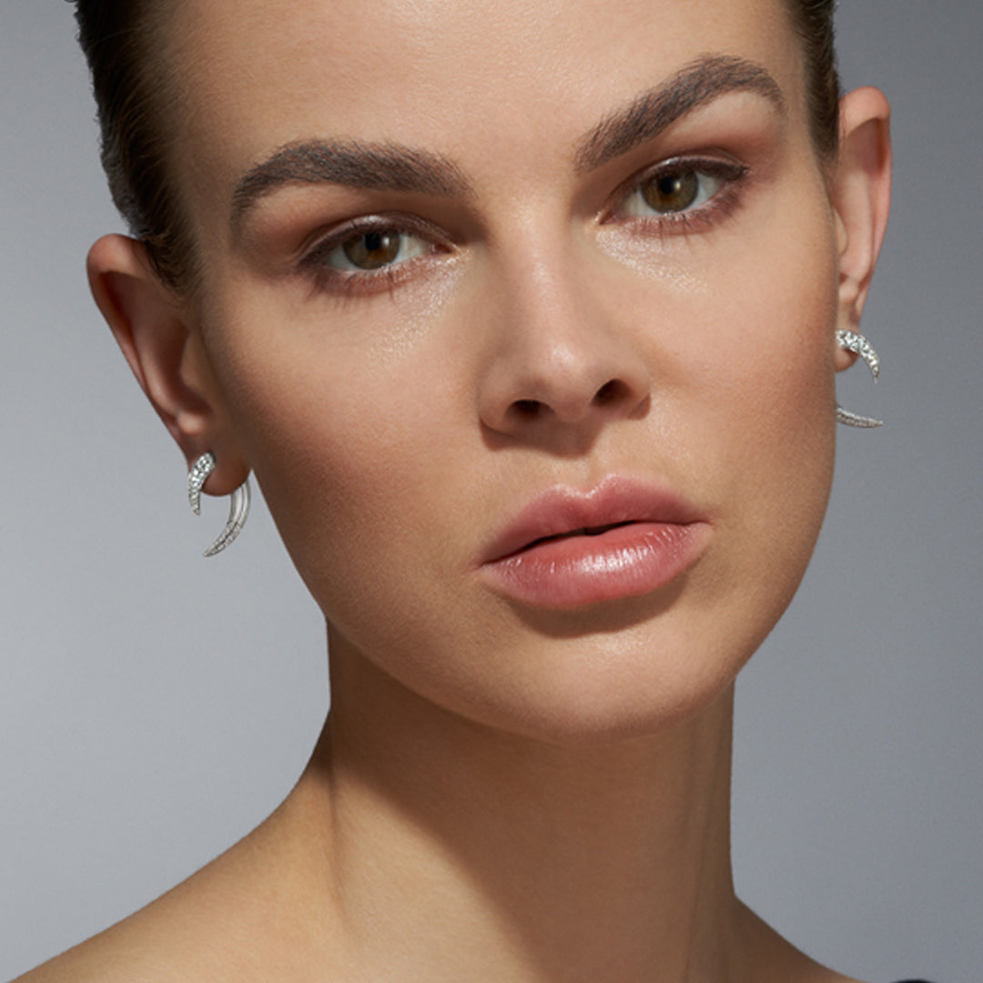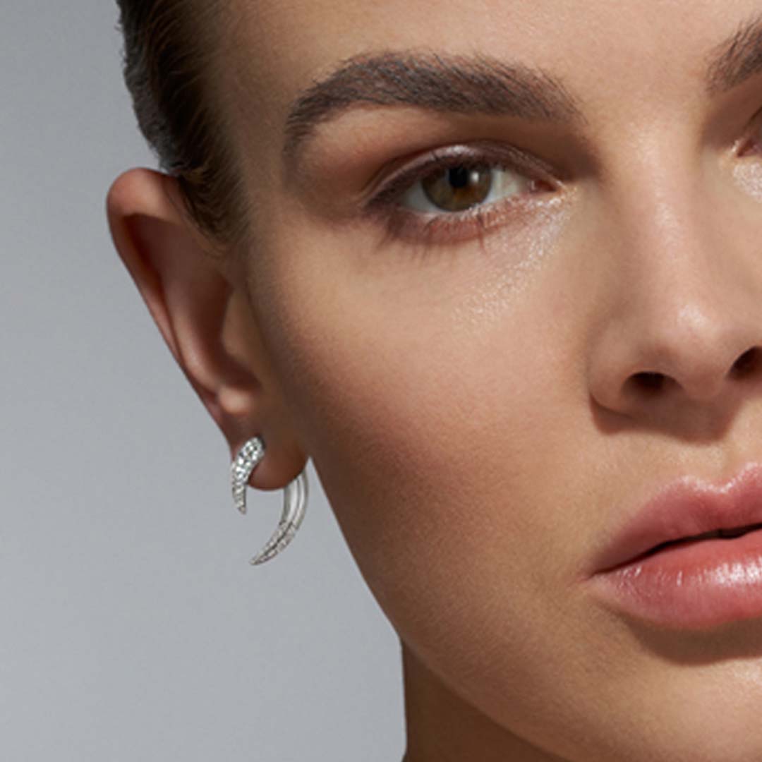 Talon Fine Large Earrings are handcrafted from 18ct white gold and 0.90cts of brilliant white diamonds. The Talon Fine collection takes a renowned silhouette of perfect knife-edged curves and fuses unbound imagination. A contemporary take on hoop earrings, the inclusion of diamonds - from tip to tail - offers a more precious alternative, with pieces to suit all tastes. Precision-set pave diamonds draw light towards the face, providing a further layer of sophistication, taking you through to evening. With an exquisite drop of 20mm in length, and a meticulous 360 degree finish, always. Expect perfection.