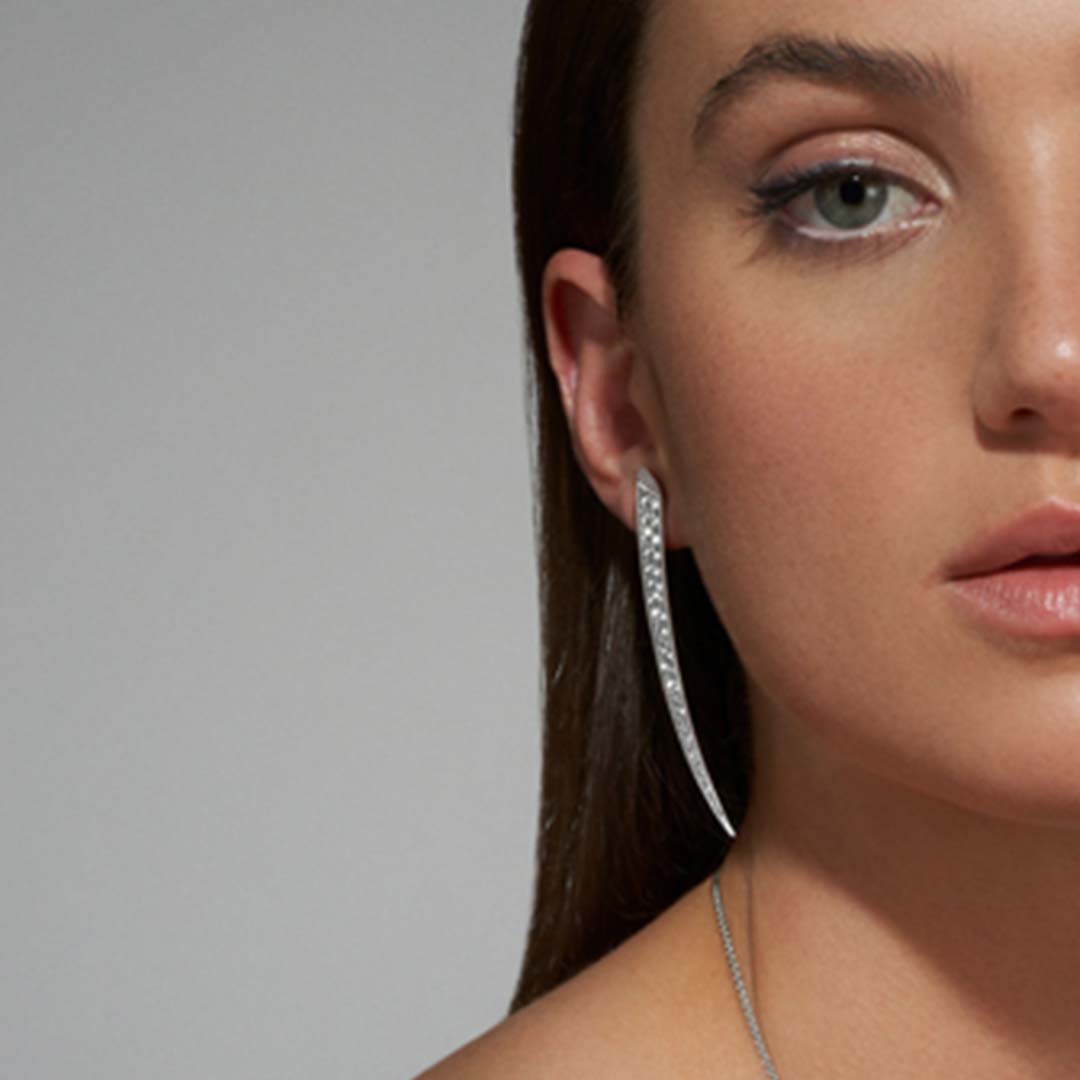 Crafted from 18ct white gold and 3.42cts of brilliant white diamonds, Sabre Fine Medium Earrings combine virtuosity with renowned House of Shaun Leane glamour. The Sabre silhouette is an elegant yet dangerous curve, and one of our House signatures. These diamond drop earrings swoop your jawline, reflecting light on skin. A spectacular, knife-edged white diamond facade is seen from all angles, framing your face perfectly and elongating your neck. Designed with a left and right side and secured at the back with a butterfly, our earrings transition effortlessly from day to evening.