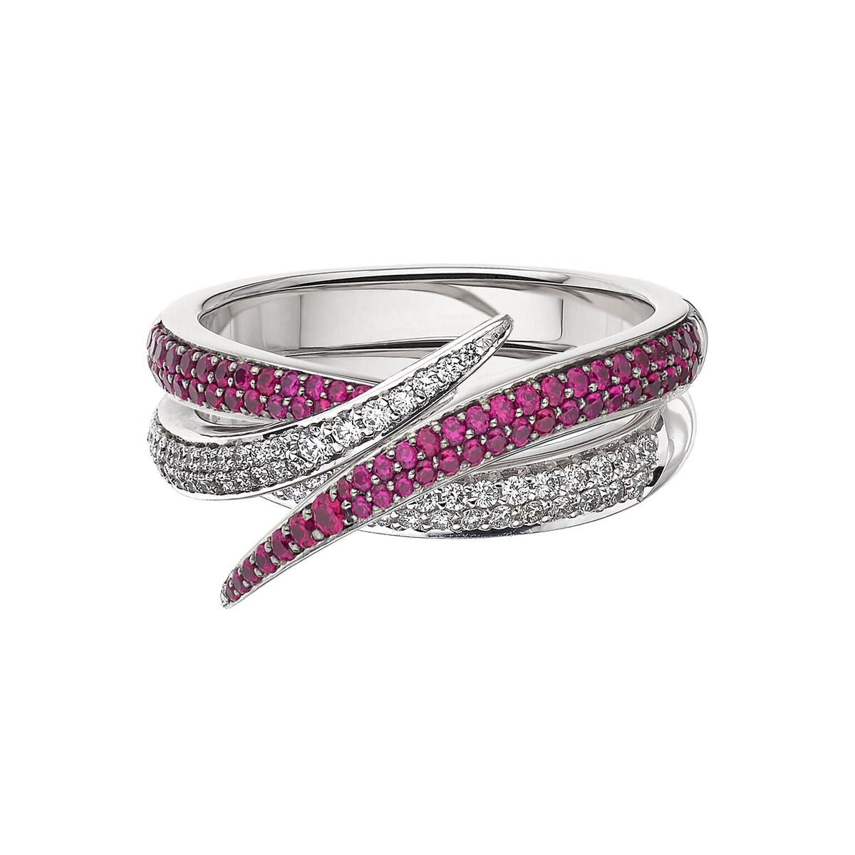 Interlocking Duo Ring is handcrafted from 18ct white gold and 0.93cts of pink sapphires and white diamonds, a timeless two-ring set by the House of Shaun Leane. Precious gem-set curves envelope the finger with double rows of diamond pavé, revealing a sliver of resplendent monochrome. Our Interlocking rings are renowned for their precision line and accented sweeping points, designed as layerable jewels to be stacked and assembled over time. In a playful kaleidoscope of colourful gemstones and finishes, offering infinite wearing possibilities.