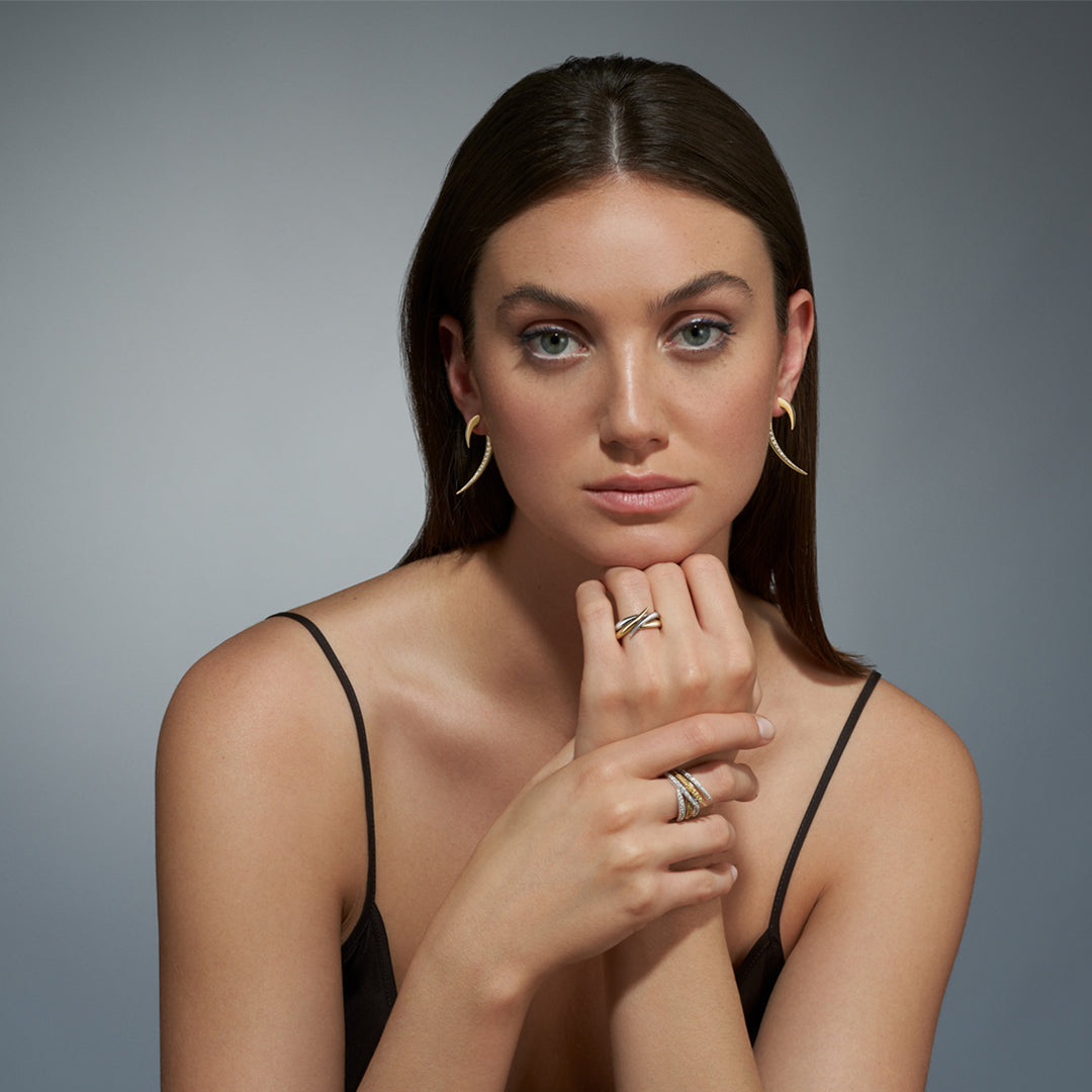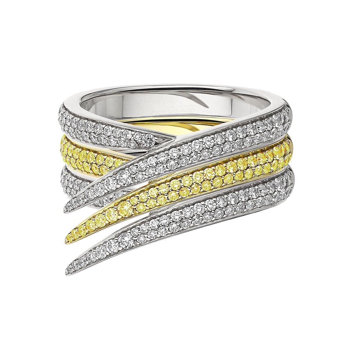 Interlocking Stacked Ring is handcrafted from 18ct white and yellow gold and 1.42cts of brilliant white diamonds and yellow sapphires, an opulent three-ring set by the House of Shaun Leane. A snaked silhouette of fluid lines and accented sweeping points, curve to the contours of the finger. Double rows of diamond pavé, reveal a slither of yellow sapphires. Our award-winning Interlocking rings are designed as versatile, layerable jewels to be stacked and assembled, in a colourful mix of gemstones and finishes. Or go for the complete set - ready to be adorned and treasured forever.