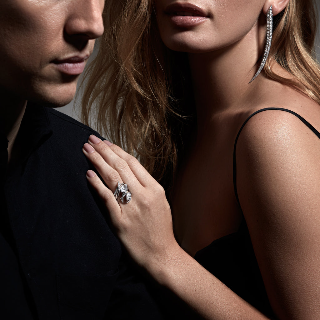 The Interlocking Ariana Eternity Ring Set is from the House of Shaun Leane's award-winning Interlocking collection. Three extraordinary handcrafted 18ct white gold and white diamond rings, enwreathe a magnificent pair of brilliant white pear-shaped diamonds totalling 1ct. Illustrious curves of diamond pavé leap over and above, in a powerful, interconnected geometry. Exquisite in their own right; our Ariana Engagement, Wedding and Eternity Rings dazzle when layered, in the ultimate ceremonial suite. Royals, collectors, aficionados, all favour our Ariana rings; themselves, the affairs of legends. Driven by design, they assemble into show-stopping sets. Impeccable craftsmanship pushes the boundaries of high jewellery. Finesse is a forte, unmistakably Shaun Leane.
