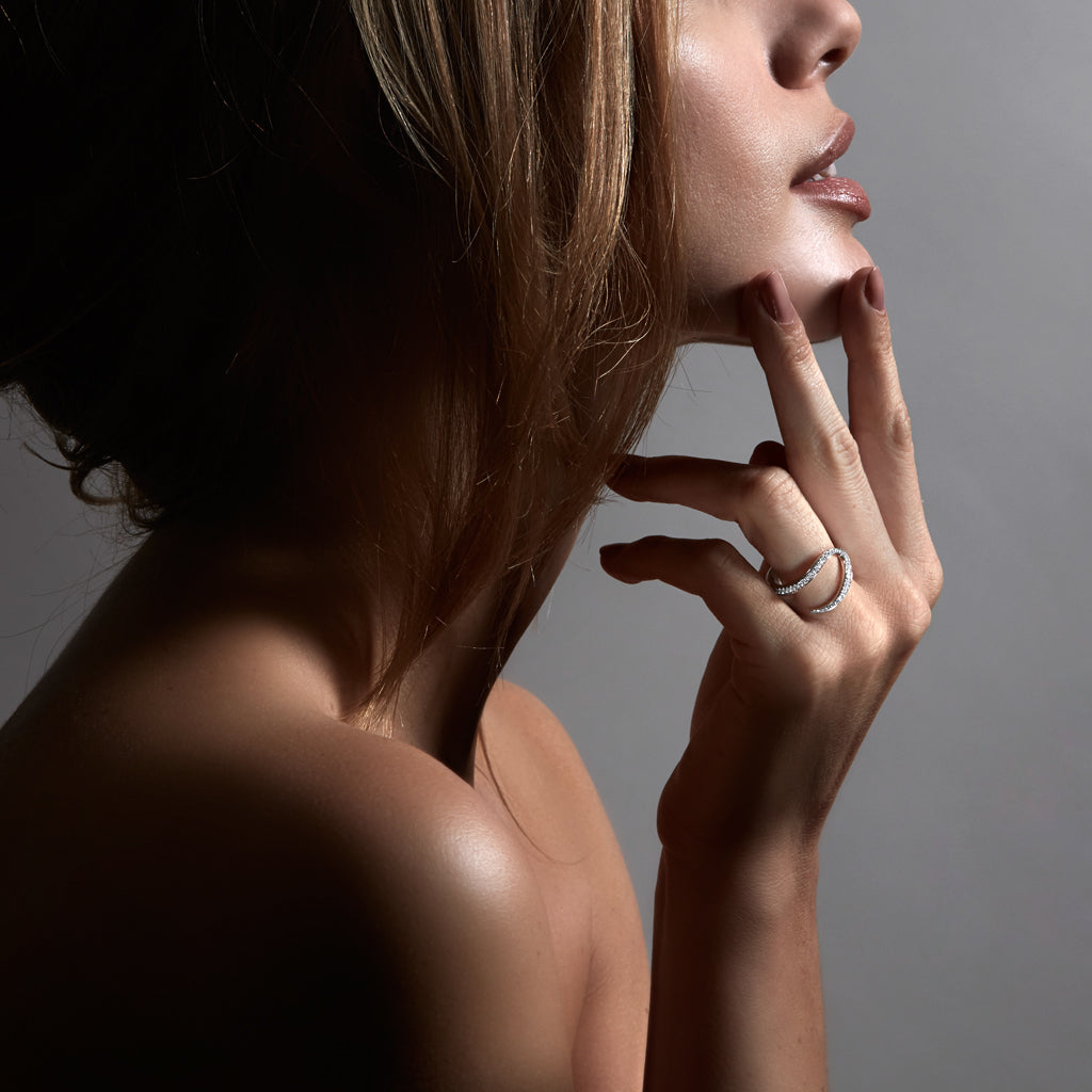 The Interlocking Ariana Wedding Ring is from the House of Shaun Leane's award-winning Interlocking collection. Handcrafted from 18ct white gold, its precious, gem-set curves envelope the finger with double rows of pavé diamonds, weighing 0.37ct. A flexuous silhouette is punctuated with the Leane signature sharp edge. Exquisite worn alone; extraordinary when layered with our Ariana Engagement and Eternity Rings, in the ultimate ceremonial suite. Royals, collectors, aficionados, all favour our Ariana rings; themselves, the affairs of legends. Driven by design, they assemble into show-stopping sets. Impeccable craftsmanship pushes the boundaries of high jewellery. Finesse is a forte, unmistakably Shaun Leane.