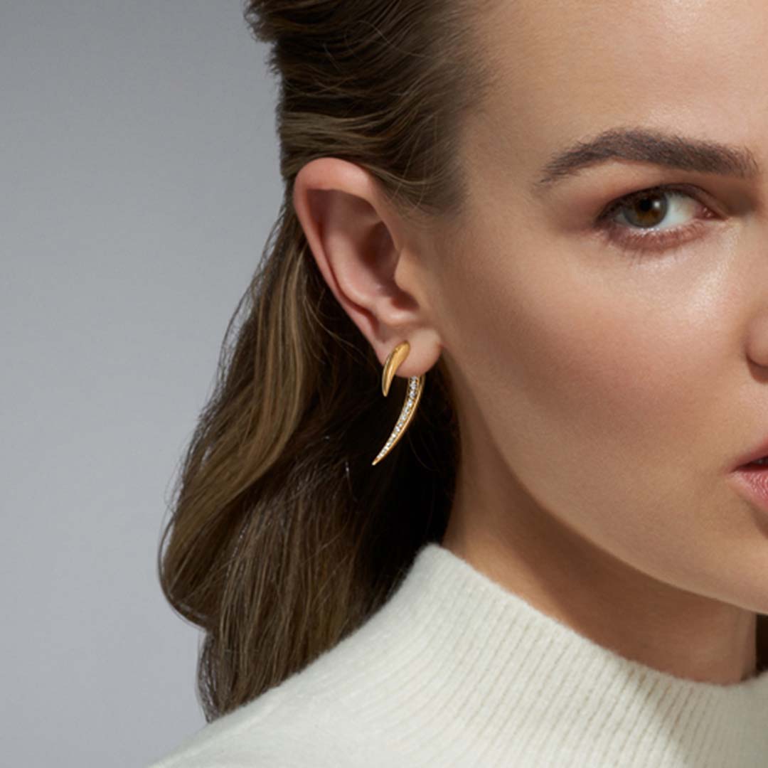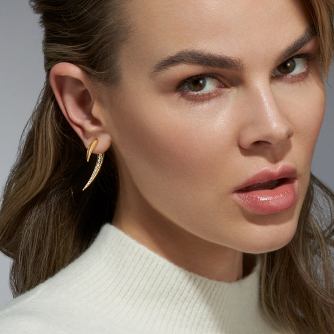 Hook Fine Earrings are handcrafted from 18ct yellow gold and 0.59cts of brilliant white diamonds, a luxurious take on a House classic. Our Hook silhouette - a powerful curvilinear line - is a modern classic, first appearing in the Alexander McQueen 1996 show, Hunger. The House of Shaun Leane has updated this silhouette for our Hook Fine collection; in solid 18ct yellow gold, a perfect curve of precision-set pavé diamonds sweep the jawline, illuminating the wearer's profile. Iconic earrings with stature, weight and presence, the inclusion of diamonds brings drama to daywear and fast elevates evening. Renowned for our 360 degree meticulous finish, expect perfection from any angle.