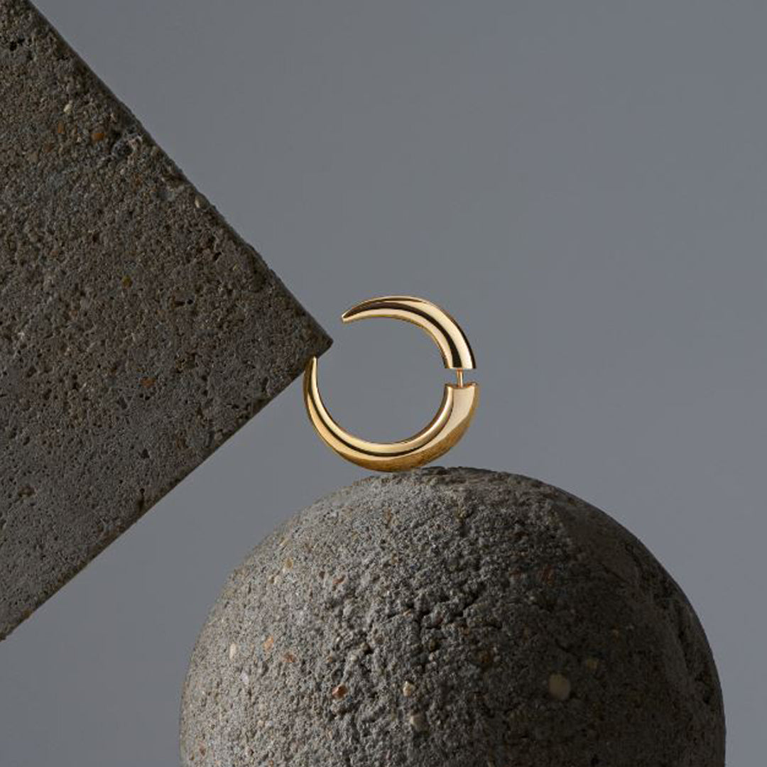 Handcrafted from yellow gold vermeil, Talon Large Hoop Earrings are a unique alternative to golden hooped earrings. Talon's innovative design is a two-piece construction, seamlessly fitting together, creating a nuanced shape around the ear, securely fastened in place. Our Talon Large Hoops follow a rounded, bulbous silhouette, tapered front to back, gently flattened, graduating to a pointed tip. Designed with a left and right side, our Talon Hoops curve away from the face, embodying the creatures and forms that come alive in the pink dusk. Talon sits at the heart of our House code, Fauna; a focus on organic silhouettes - fossils, feathers, bones and claws - jewels with an aura, rendered with care and precision. Designed to integrate with the body, our Talon Hoops follow through the ear, in larger sizes that reflect the strength and fragility of life.