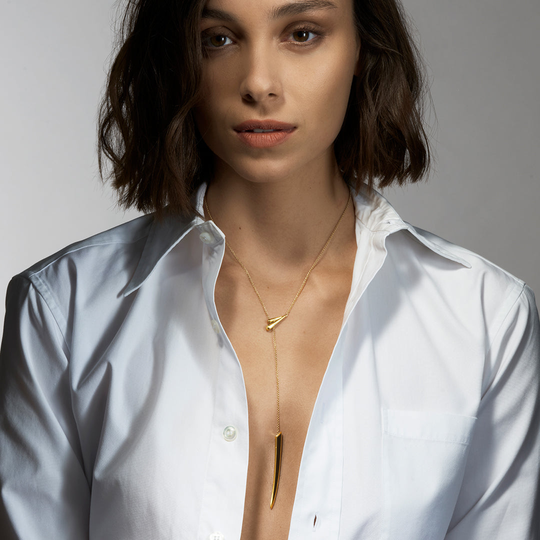 Sabre Deco Long Necklace is handcrafted from yellow gold vermeil and black ceramic. Sabre Deco is Sabre's powerful arc emboldened, combining a high-contrast of hybrid materials with couture elegance. Worn long and languorous, a yellow gold vermeil Sabre silhouette suspends to the torso, graduated and tapered with sweeps of black ceramic inlay guiding the shape downwards, the lariat secured by two small Sabre curves, hand-carved from yellow gold vermeil. An adjustable sliding mechanism allows for length adjustment. Sabre Deco's bold, architectural style gives sharp designs refinement. Sharp contrasts in colour reflect the changing effects of light - an effect of making colours move. Delicate detailing such as hand-carved pieces and a 360 degree knife-edge finish are exquisite touches. Our House code, Line, inspires a collection of geometric, sensual jewels with textural elements you can run your fingers over.