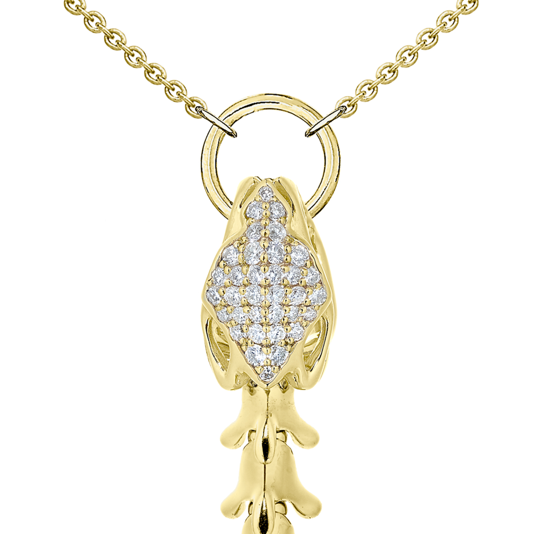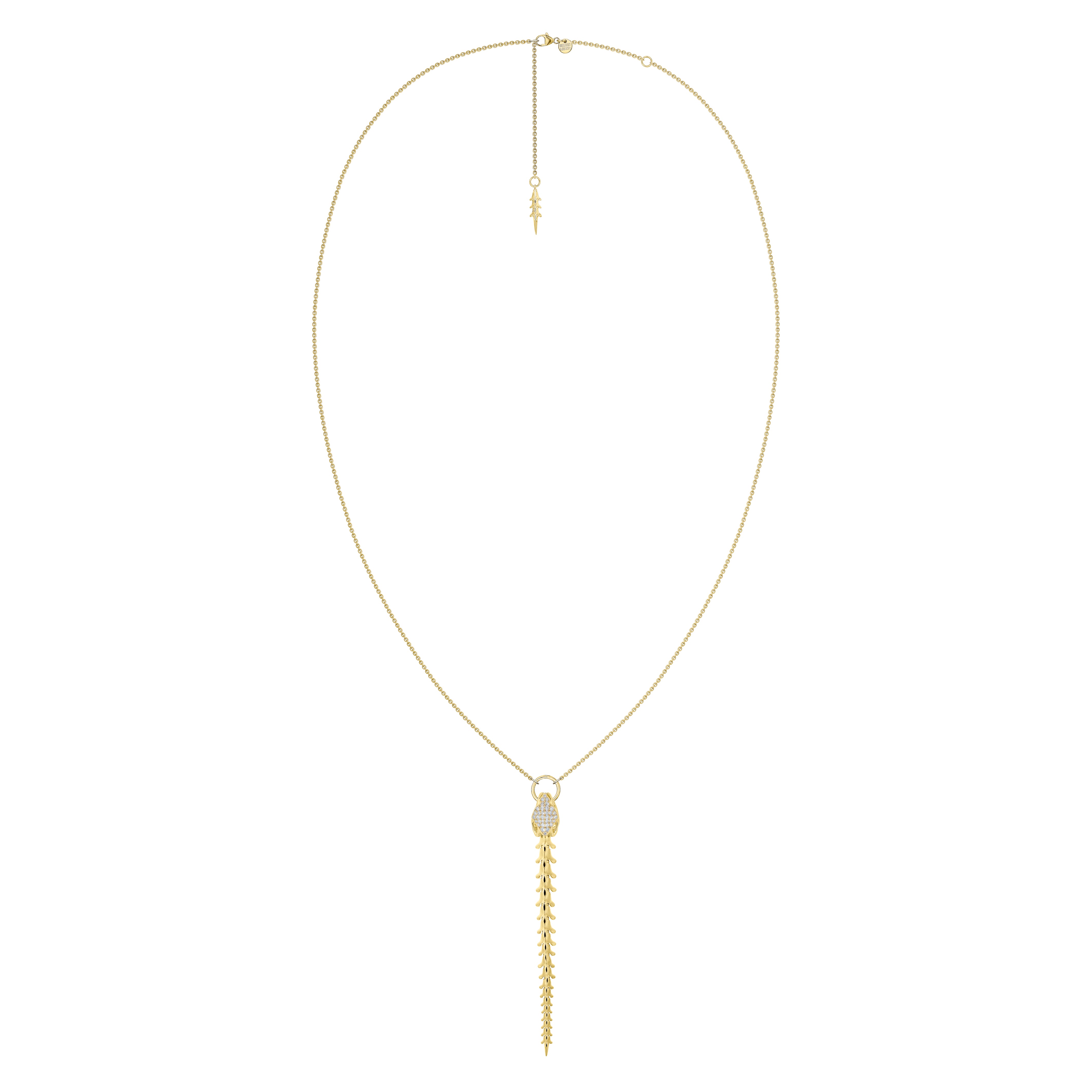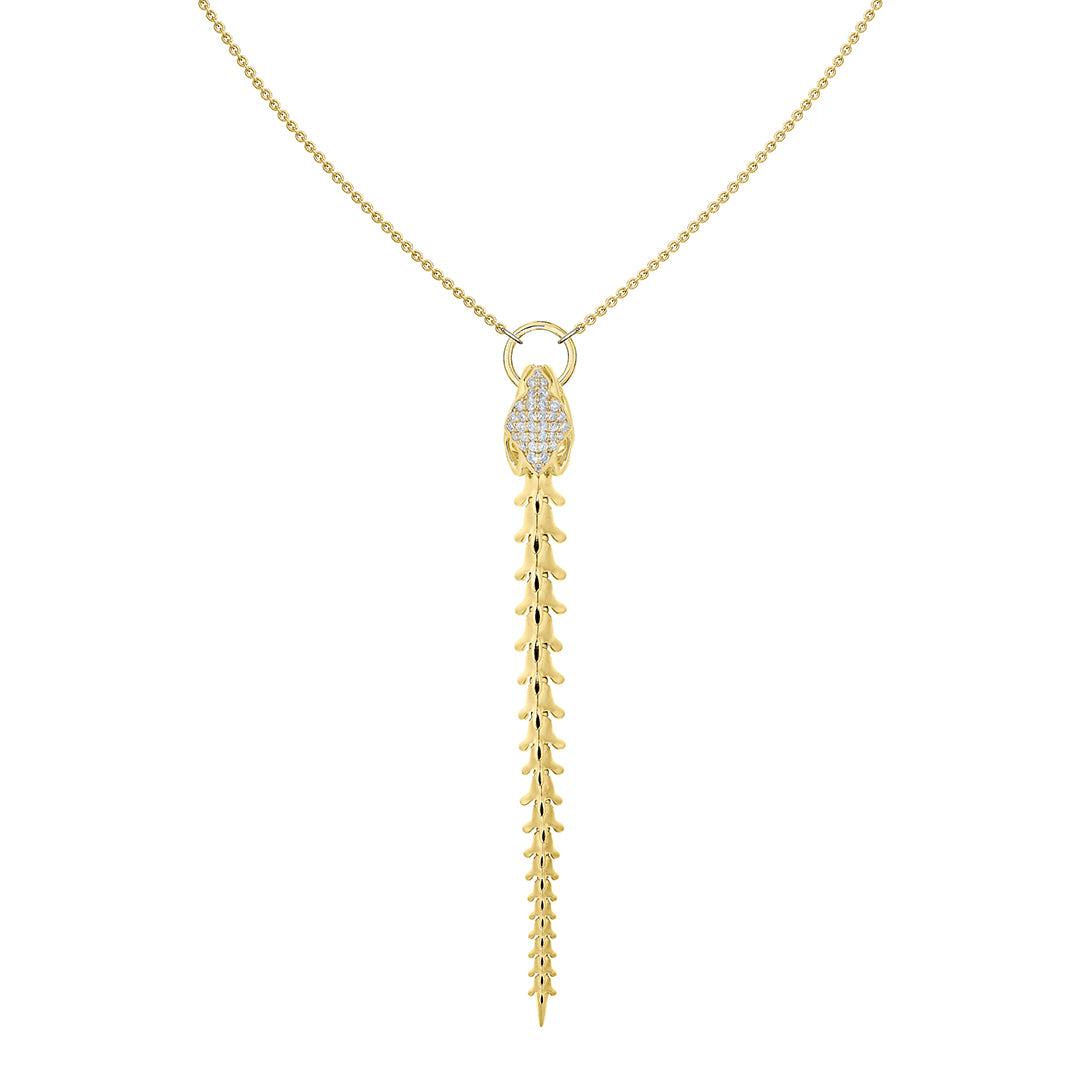 Handcrafted from yellow gold vermeil and 0.33cts of brilliant white diamonds, our Serpent's Trace Drop Pendant takes inspiration from the aluminium Coiled Corset Shaun Leane made for Alexander McQueen. A single perfectly graduated vertebrae of articulated yellow gold vermeil pieces of bone suspend the colletage, ensnared in the bejewelled jaws of the serpent's skull - diamond encrusted. Designed to move with the wearer, each piece of gilded bone has its own precise movement, conjuring the hypnotic slither of the serpent as it sways, catching the light. The piece becomes a breathing work of art, sinuously moving across the collarbone. Mechanical, light-reflecting, technically dazzling, the Serpent silhouette took our Mayfair team of trained goldsmiths four years to perfect. Leane's creations breathe life into a mythological legend. Adjustable to individual three lengths. Also available without diamonds.