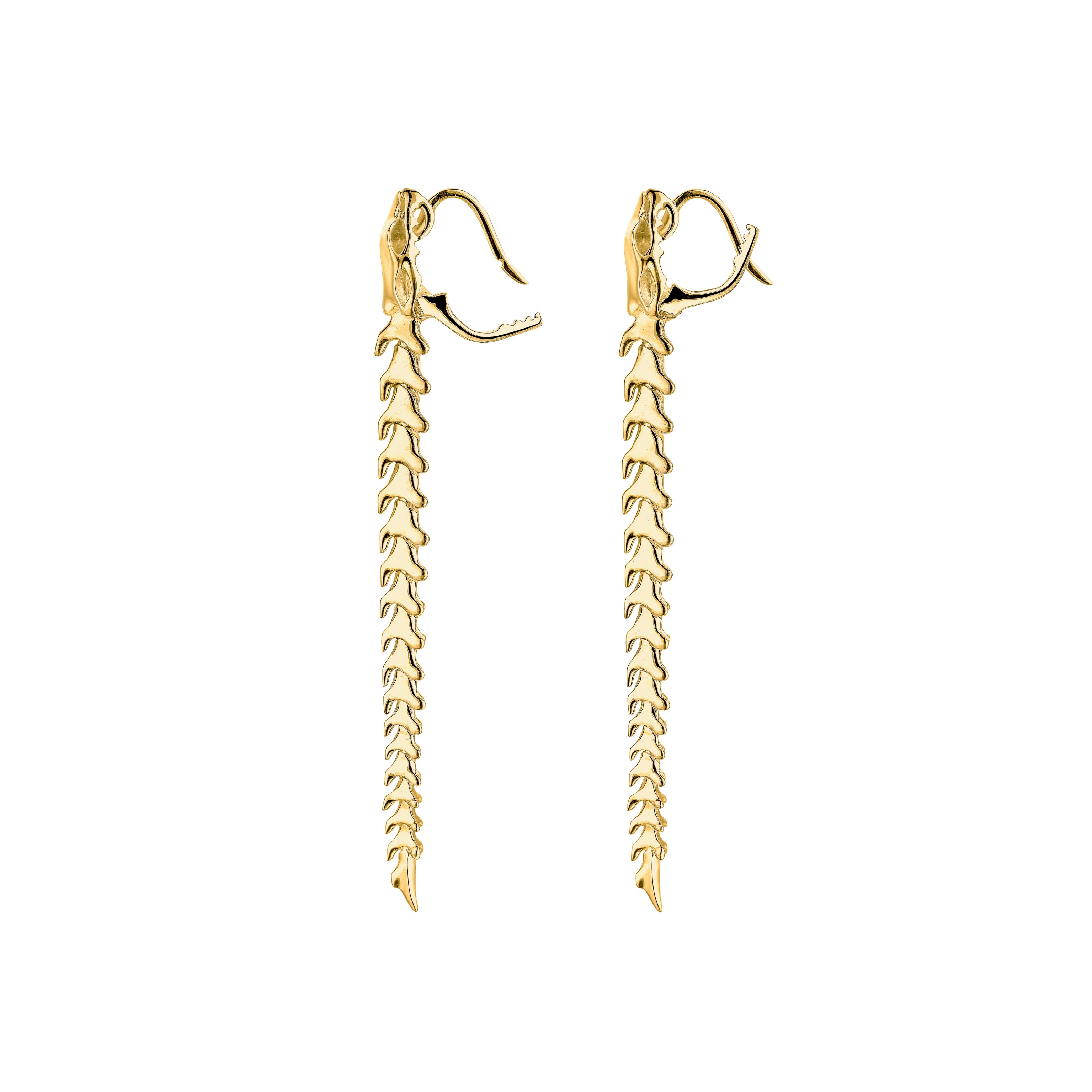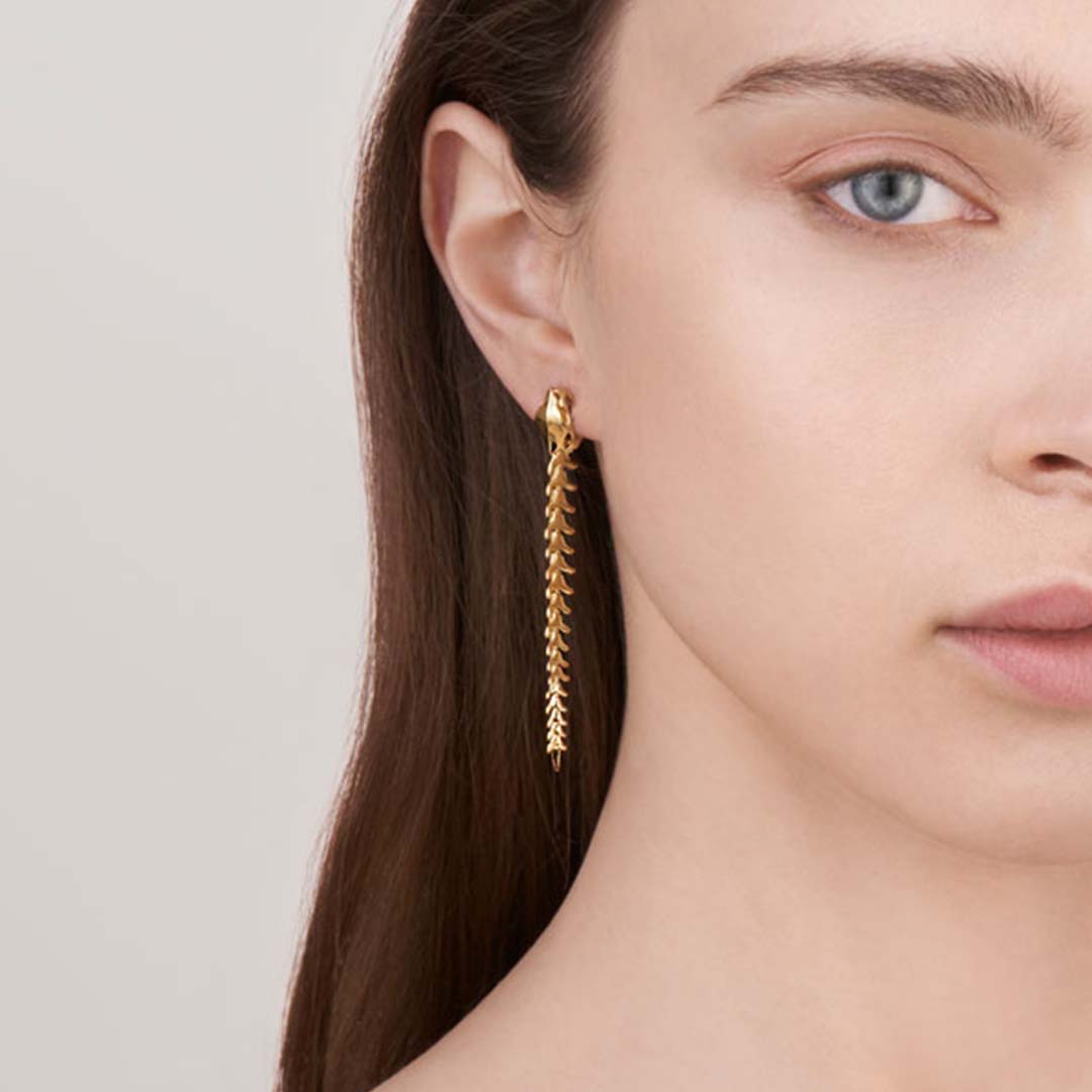 Handcrafted from yellow gold vermeil, our Serpent's Trace Drop Earrings take inspiration from the aluminium Coiled Corset Shaun Leane made for Alexander McQueen. Perfectly graduated vertebrae of articulated yellow gold vermeil pieces of boneattach to the ear from the bejewelled jaws of the serpent's skull. Each piece of bonehas it own precise movement, conjuring the hypnotic slither of the serpent as the earrings sway, catching the light. Combining traditional goldsmithing with an eye for the avant-garde, the Serpent silhouette took our Mayfair team of trained goldsmiths four years to perfect. Our spin on evening drop earrings are supple, playful, kinetic jewels that move with the wearer. They are the ultimate statement in glamour. Also available with diamonds.