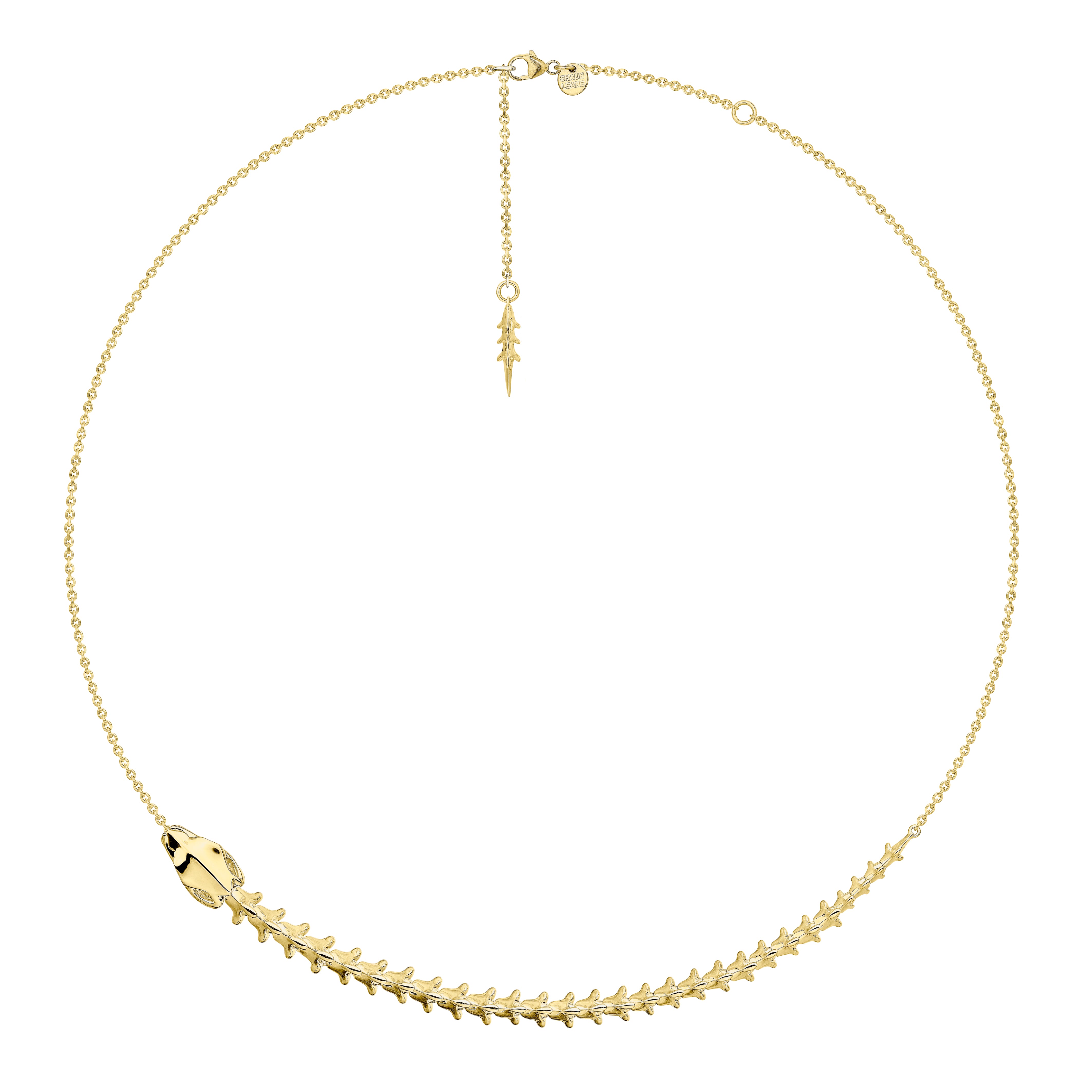 Handcrafted from yellow gold vermeil, our Serpent's Trace Necklace take inspiration from the aluminium Coiled Corset Shaun Leane made for Alexander McQueen. An elongated vertebrae of articulated yellow gold vermeil pieces of bonecurve the front of the neck, effecting the serpent undulating across your skin. Each piece of gilded bonehas its own precise movement, conjuring the hypnotic slither of the serpent as it glides, head first - horizontally - designed to lie perfectly on the collarbone. Mechanical, light-reflecting and technically dazzling, the Serpent silhouette took our Mayfair team of trained goldsmiths four years to perfect. Leane's creations breathe life into a mythological legend. Adjustable to three individual lengths.