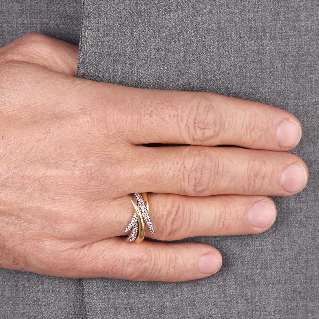Interlocking Duo Ring is handcrafted from 18ct yellow and white gold and 0.49cts of white diamonds, a timeless two-ring set by the House of Shaun Leane. Precious gem-set curves envelope the finger with double rows of diamond pavé, revealing a sliver of resplendent monochrome. Our Interlocking rings are renowned for their precision line and accented sweeping points, designed as layerable jewels to be stacked and assembled over time. In a playful kaleidoscope of colourful gemstones and finishes, offering infinite wearing possibilities.